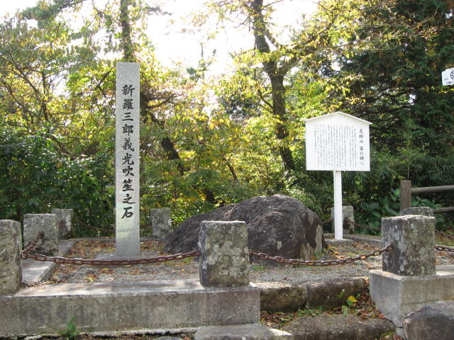 義光は源頼義の子、八幡太郎義家の弟で、琵琶湖のほとり三井寺近くの森羅の森で元服した為の名前。欧州征伐の後3年の役で苦戦する兄、源義家を助けに数十騎の兵を連れてここを通過する際、相伝の秘曲を豊原時秋に伝授してここから京都に戻らせた。